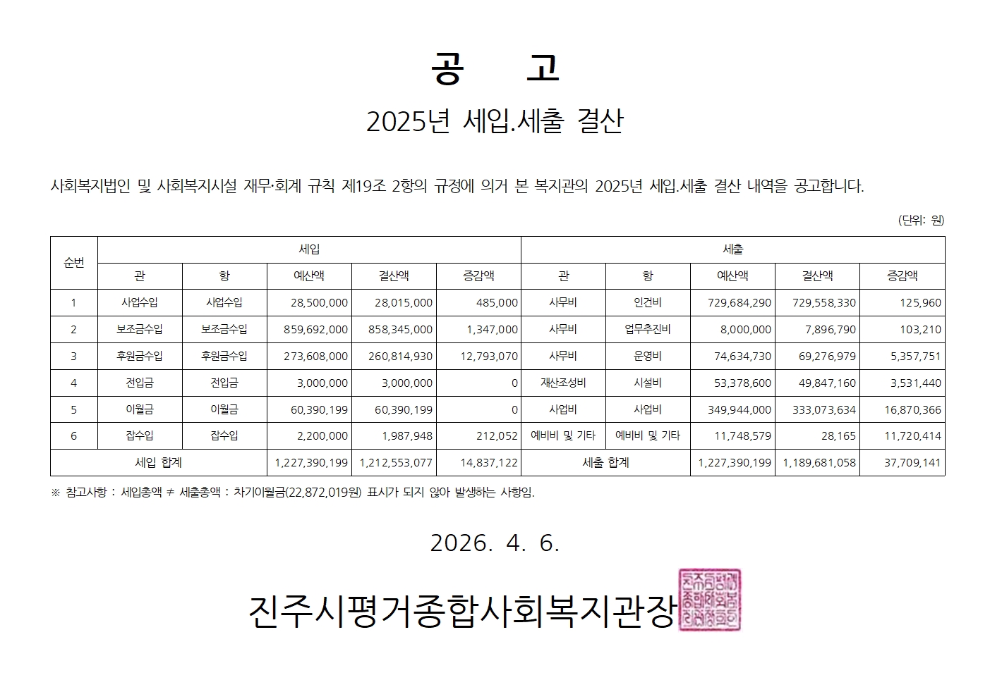 2025년 진주시평거종합사회복지관 세입•세출 결산서 및 후원금 수입•사용내역 공고